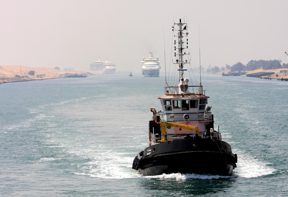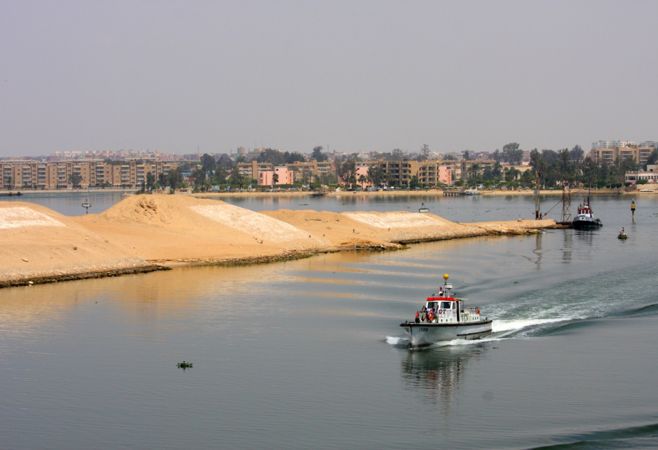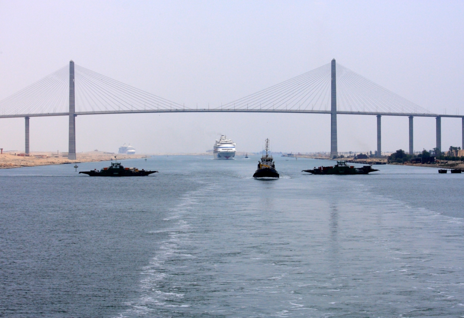 4月28日(水曜日)スエズ運河通狭、朝5時スエズ抜錨を出港、飛鳥Ⅱが先頭で運河入口に向かう、通航規則では、軍艦、客船、コンテナー船、タンカーの順番で航行するようで、今回の通狭は飛鳥Ⅱが先頭で後ろに、大型客船2隻が続いてスエズ運河に入った。