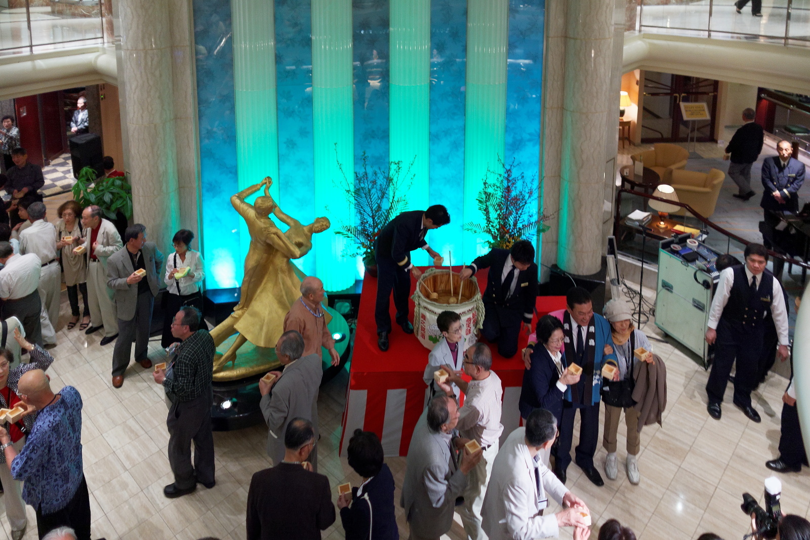 何度見ても出港風景には感動する。夕食は、右舷側に開聞岳を見ながらのサンセットディナーで世界一周に向けての赤飯と航海の安全にひっかけて安航汁(アンコウ汁)、あん肝が美味しかった。横浜で330名、神戸で130名、鹿児島で30名、乗組員470名、飛鳥Ⅱは960名を乗せて世界一周クルーズへ、船長の話では飛鳥の航海の中で一番少ない乗客とのことで、今回のクルーズは乗客とクルーにとって最高の世界一周クルーズになるが、会社(郵船クルーズ)にとっては最悪の世界一周クルーズだそうです。 夕食後19時30分から5デッキ、レセプション前の「アスカプラザ」で2010年の世界一周クルーズの幕開けを祝って鏡開きが行われました。末長船長、加藤機関長、川上ホテルマネジャーの3名により 、鏡開きが威勢よく行われ升酒が振る舞われました。