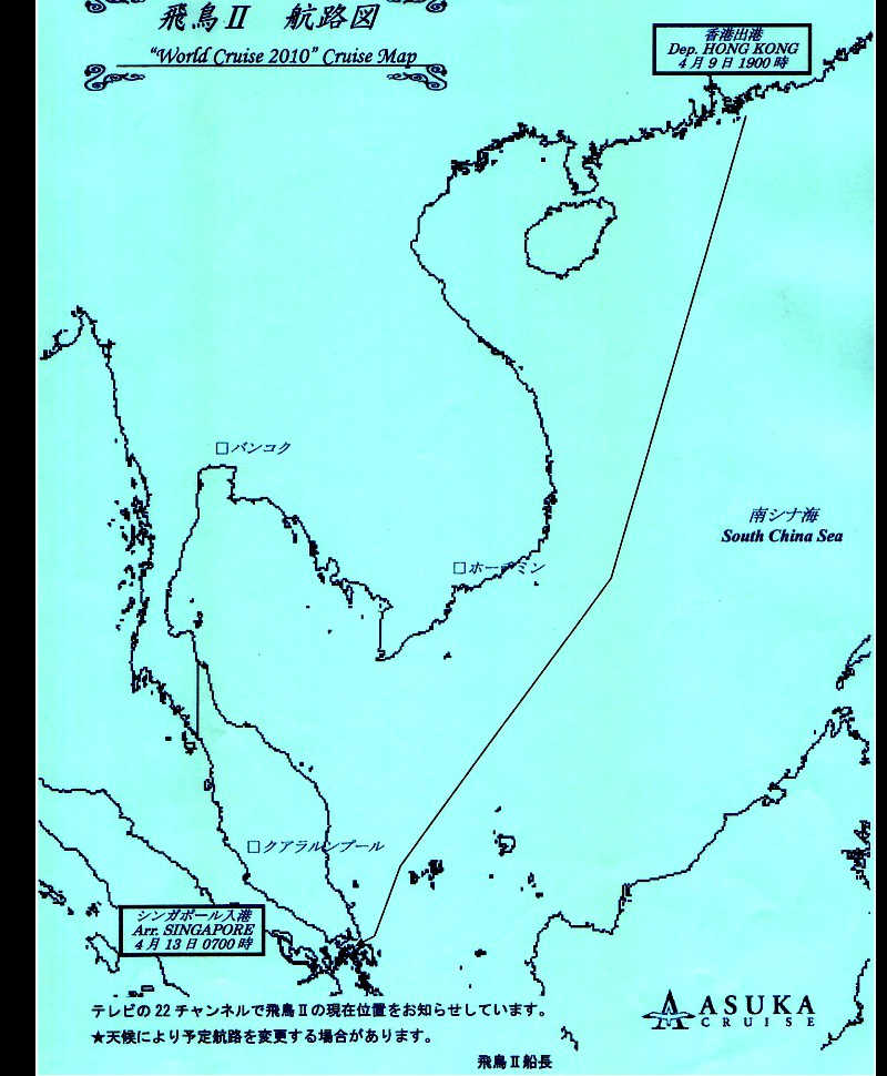 航路図 香港~シンガポール(南シナ海マレー半島沖を終日航海) 出港現在地 ,ec7b3e19-443e-4647-bc36-f8c550f9cefd,,{"tempId":"gdefault","gmapWidth":"100","gmapWidthUnit":"%","gmapHeight":"450","gmapHeightUnit":"px","gmapZoomLevel":8,"gmapScrollWheel":false} Previous Page HOME Travels top