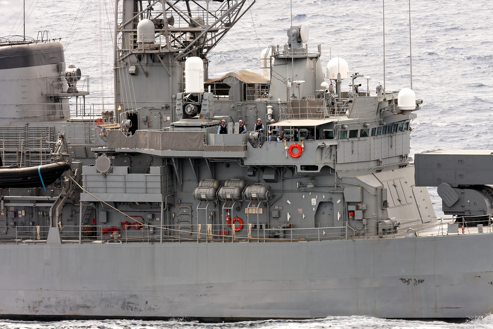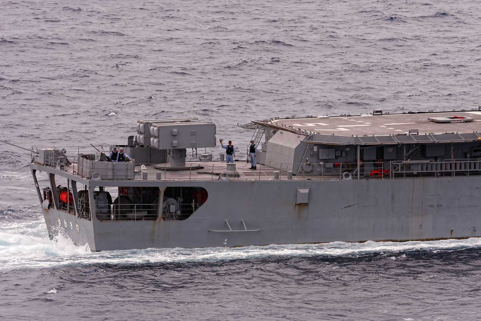 4月23日(金曜日)アデン湾を終日航海、海賊対策で外出禁止の中、自衛隊護衛艦に守られ船団を組み 航行です。午前9時から、12デッキの外出禁止が解かれ、護衛艦の「さわぎり」が飛鳥Ⅱの右舷側300mに接近エールを交換した。2機のヘリコプターが上空を旋回したり 、飛鳥Ⅱの間近でフォバーリングを行い。「さわぎり」の乗組員が甲板に出てお互いに、手をふったり写真を撮ったりした。末永船長の船内放送での説明後、飛鳥Ⅱの後部の国旗を下げ答礼、「さわぎり」からもメインマストの日章旗が下げられ返礼が、ついで飛鳥Ⅱ右舷側後方から哨戒機「P3C」が、低空飛行で飛鳥Ⅱと「さわぎり」の間を通過、迫力満点、飛鳥Ⅱの乗客からは一斉に護衛艦に向かって”ありがとう”の大合唱、日の丸の旗を振って感謝の気持ちを伝えていた。午後12時からはもう1隻の護衛艦「おおなみ」が接近、再び哨戒機 「P3C」が、飛鳥Ⅱの右舷側と左舷側を低空飛行で大サービス、その後護衛艦は通常の警戒態勢に戻った。アデン湾の焼けつくような酷暑の中、日本の船を守って活躍する自衛官の姿に感動し、感謝し、ありがとうを言いたい。