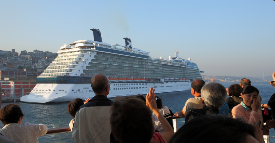 5月7日(金曜日)イスタンブール観光・出港。昨日に続いてイスタンブール停泊、今日は、半日観光でボスポラス海峡の埋立地に建てられた19世紀の宮殿「ドルマバフチェ宮殿」と「ハーレム」を見学する。ロココ調の装飾で飾られた、絢爛豪華なセラームルックと呼ばれる建物と内部を見学。またスルタン(皇帝)と女性だけが住んだ日本の大奥的な役割の「ハーレム」も見学しました。残念ながら内部は、撮影禁止で随所に政府の担当者が目を光らせて管理が厳しかった。午後は、昨日妻がワールドバザールで買ったペンダントに傷があり、取り替えに行くということで、シャトルバスの最終便で再びワールドバザールへ、現地のガイドの話では交換は不可能だ、といことであったが、妻の執念で時間ギリギリで、昨日の店を探し当て、交渉した結果は、快く交換に応じてくれ、妻は大感激、トルコ人の人柄の良さにふれ気分は最高でした。ただし、最終のシャトルバスは、ラッシュで大混雑 、通常の2倍の時間をかけて飛鳥Ⅱへ帰船しました。夕方イスタンブールを出港、7デッキで「セイルウェイパーティー」が行われ、西に傾いた太陽の眩いような光を受け、シャンペン片手にイスタンブールを離れました。