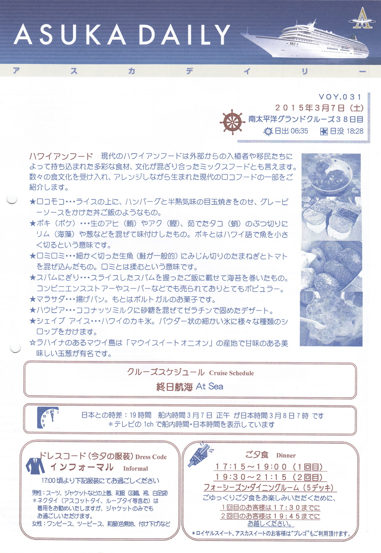 3月7日(土曜日)マウイ島向けて終日航海。明日はマウイ島入港です、マウイ島のハレアカラ火山観光を楽しみにしてますが、お天気が心配です。夕食後、船長の計らいで、ハワイ島の火山流を見るため、接近して航海してくださいましたが、残念ながらおかく光る火砕流は見えず、真っ暗な島が見えるだけでした。 フォーマル ピアノバー ゲーム ゲーム アスカデイリー インフォメーション インフォメーション 船内の催し 船内の催し 飛鳥Ⅱの航路図 北太平洋を終日航海 ,b1349c84-3038-43c7-8766-48d6f959a0f4,,{"tempId":"grayscale","gmapWidth":"100","gmapWidthUnit":"%","gmapHeight":"450","gmapHeightUnit":"px","gmapZoomLevel":7,"gmapScrollWheel":false} ,facebook,,{"commentTarget":"thisPage","pageUrl":"","toukouNum":"2","bbsWidth":"960","colorType":"light","wUnit":"px"}