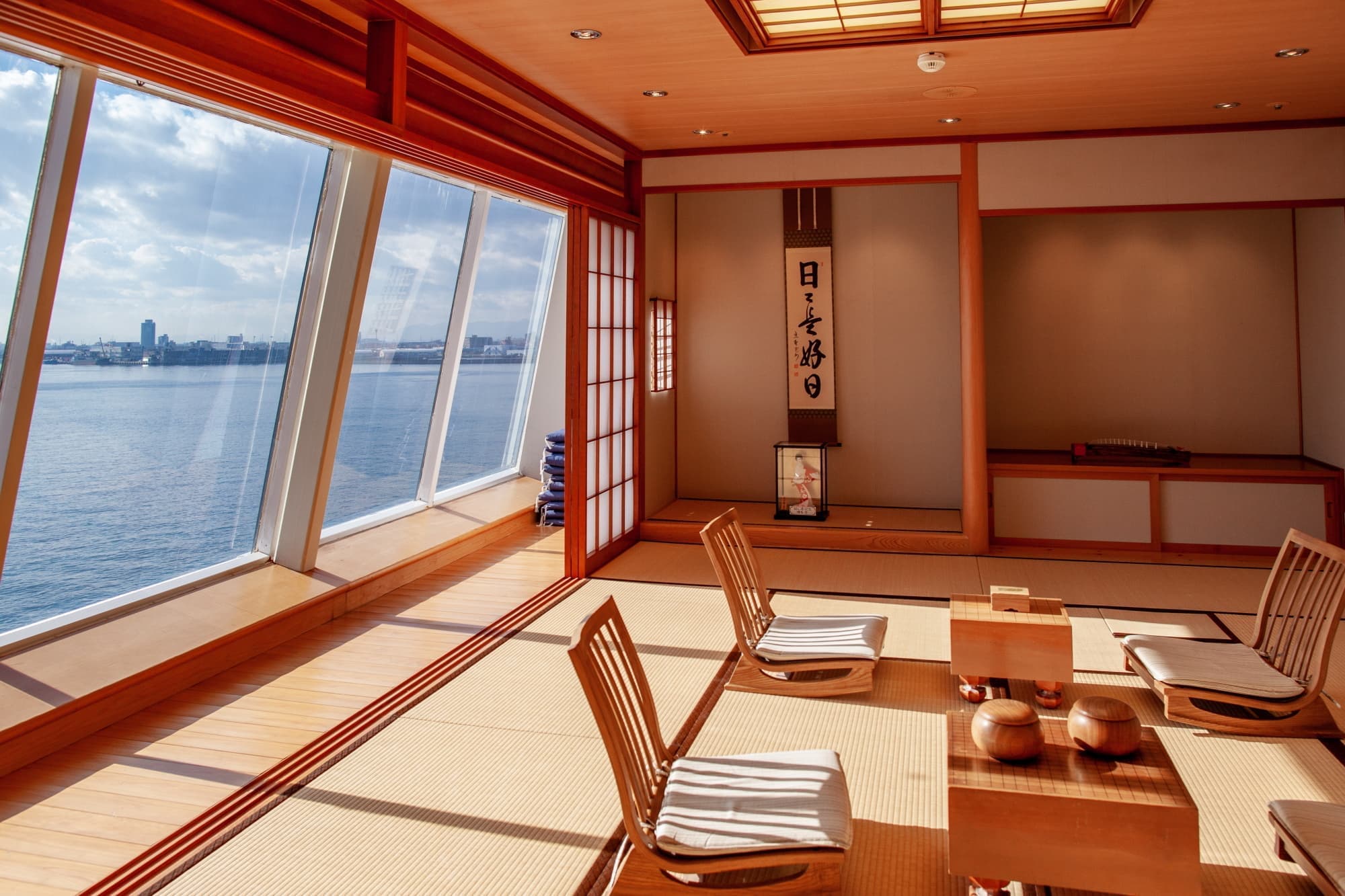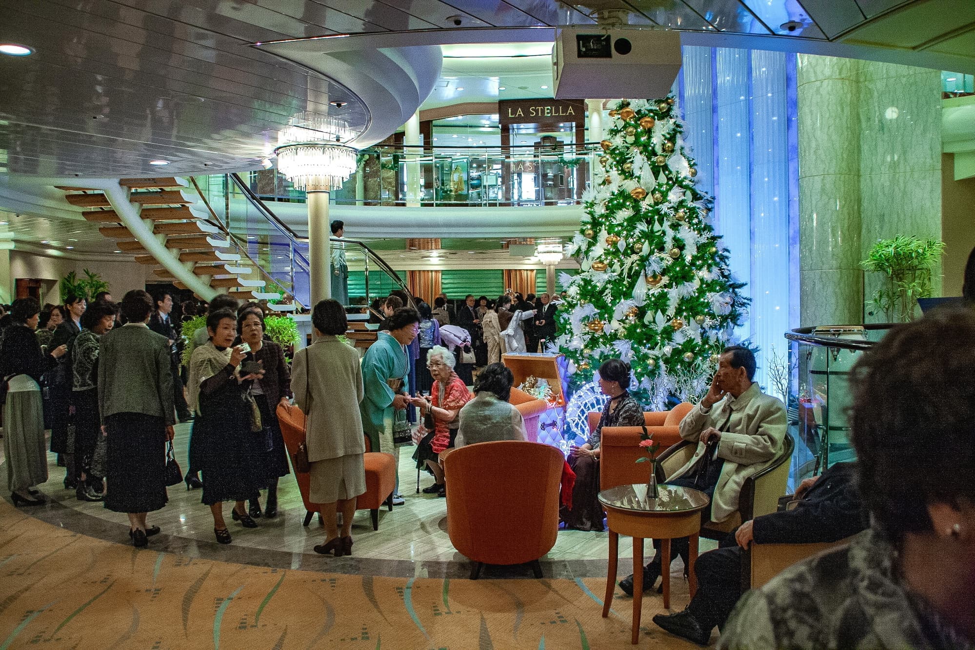 クリスマス・クルーズの出航は夕方から夜。名古屋港が夕暮れに包まれるロマンティックな時間に乗船しました。ウェルカム・ドリンクを片手に華やかなイルミネーションに彩られた名古屋港を眺めながらの出港のひとときはクリスマス・クルーズの最初のハイライトです。華やかなオリジナルショーはこの時期ならではのクリスマス・バージョン。非日常感が楽しめるカジノや、シックなバーでのカクテルタイムを楽しむうちに、船はいつの間にか港を遠く離れ、空気の澄んだ冬の星空のもとクルーズの夜は更けてゆきました。