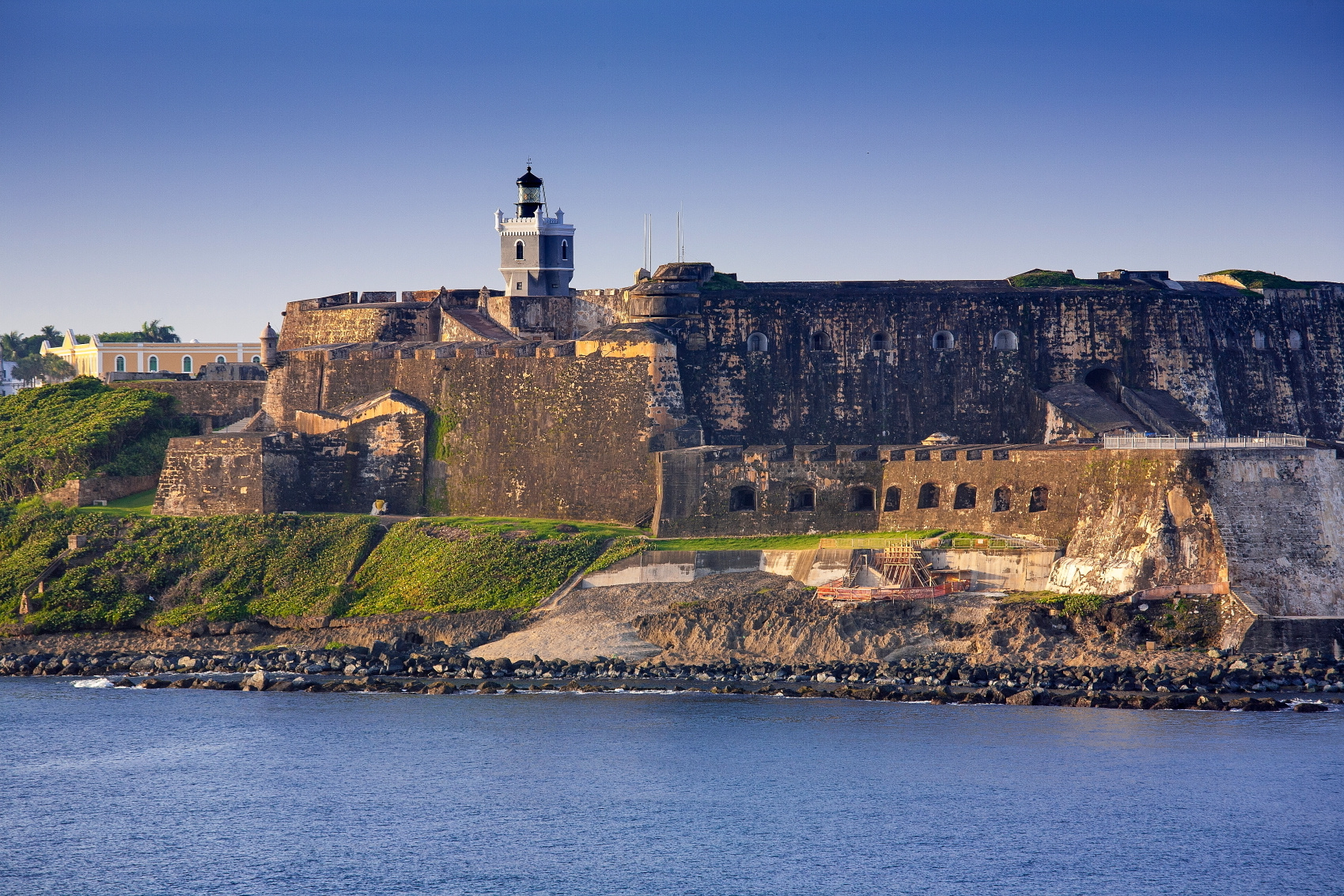 プエルトリコの世界遺産エル・モロ要塞、サンクリストバル要塞、サンファン歴史地区。サン・フアンは、アメリカ合衆国プエルトリコ島の北東部に位置する市。プエルトリコ自治連邦区の政庁所在地であり、最大の港湾都市。