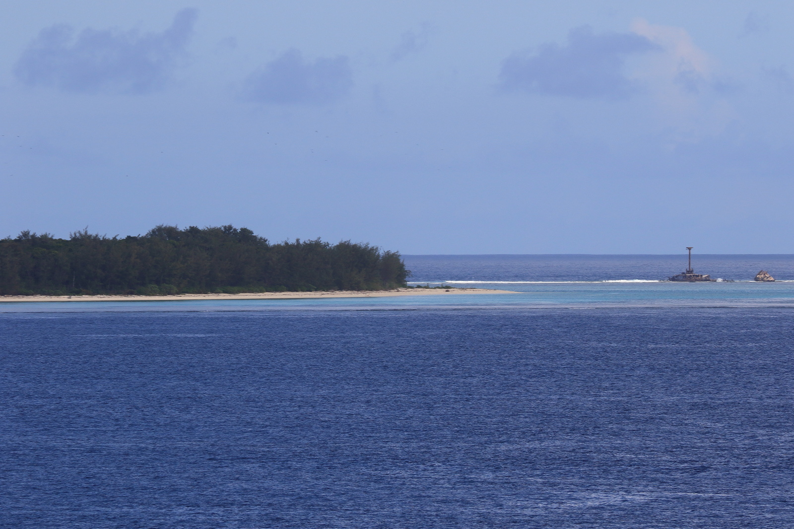 パプアニューギニアジョマード水道は狭い海域の浅瀬に沈没船のマストが見えていた。浅瀬はエメラルドグリーンの美しい風景でした。ソロモン海は太平洋南西部の海。パプアニューギニア近隣海域である。ニューギニア島の東に位置し、北はニューブリテン島、東はソロモン諸島に囲まれ、南は珊瑚海に開けている。海域南西部にはダントルカストー諸島やトロブリアンド諸島がある