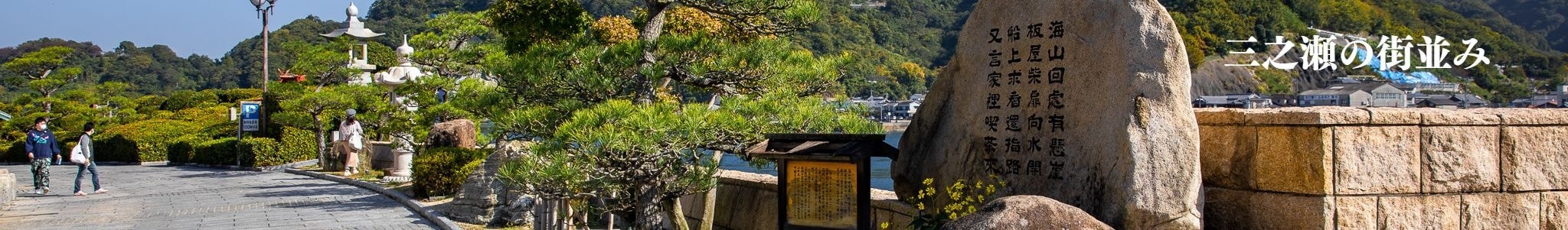 下蒲刈島は、三之瀬、下島、大地蔵の3集落があり、古くは伊予水軍の多賀谷氏が進出し、天神鼻に丸谷城を築いたことで知られ、のちの広島藩が海駅として三之瀬を整備して海本陣・茶屋などを置いた。港には石造りの雁木が残り、瀬戸内の港町らしさが残る三之瀬。参勤交代の西国大名をはじめ、琉球、朝鮮、オランダの使節も江戸等への往路復路とも蒲刈島に立ち寄っていたという。